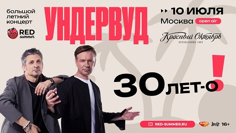 10 июля Ундервуд даст большой летний концерт «30 ЛЕТ-О!» на «Красном Октябре». Отметим юбилей группы на бис под открытым небом в рамках фестиваля Red Summer!