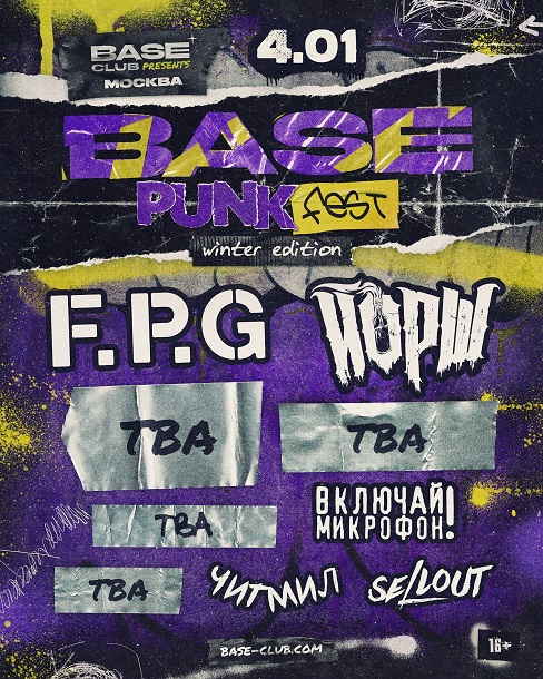 Сцену столичного BASE разделят самые топовые панк-команды страны и актуальные фрешмены этого направления: F.P.G, ЙОРШ, «Включай Микрофон!», Sellout и другие!